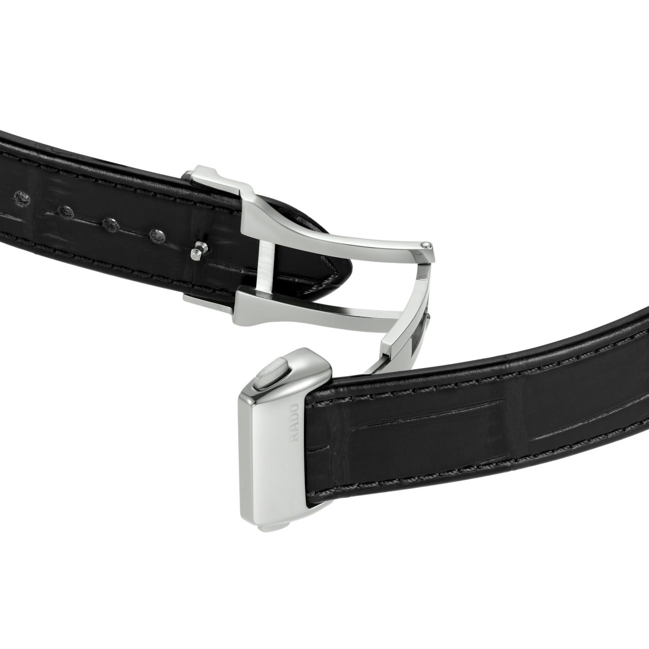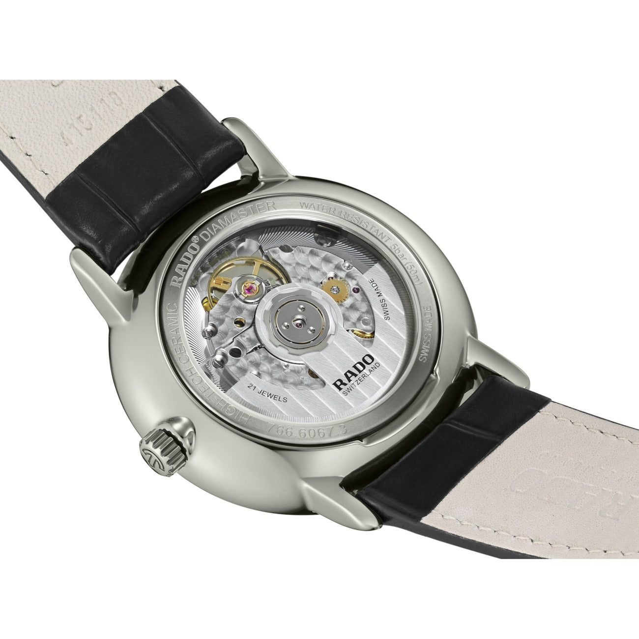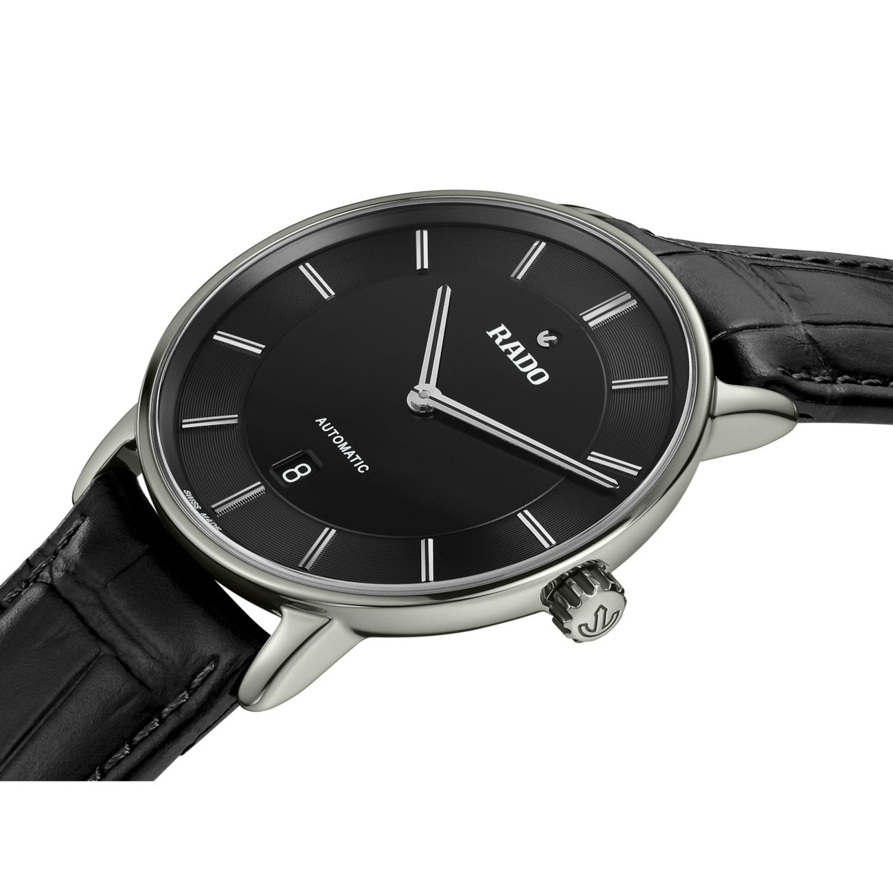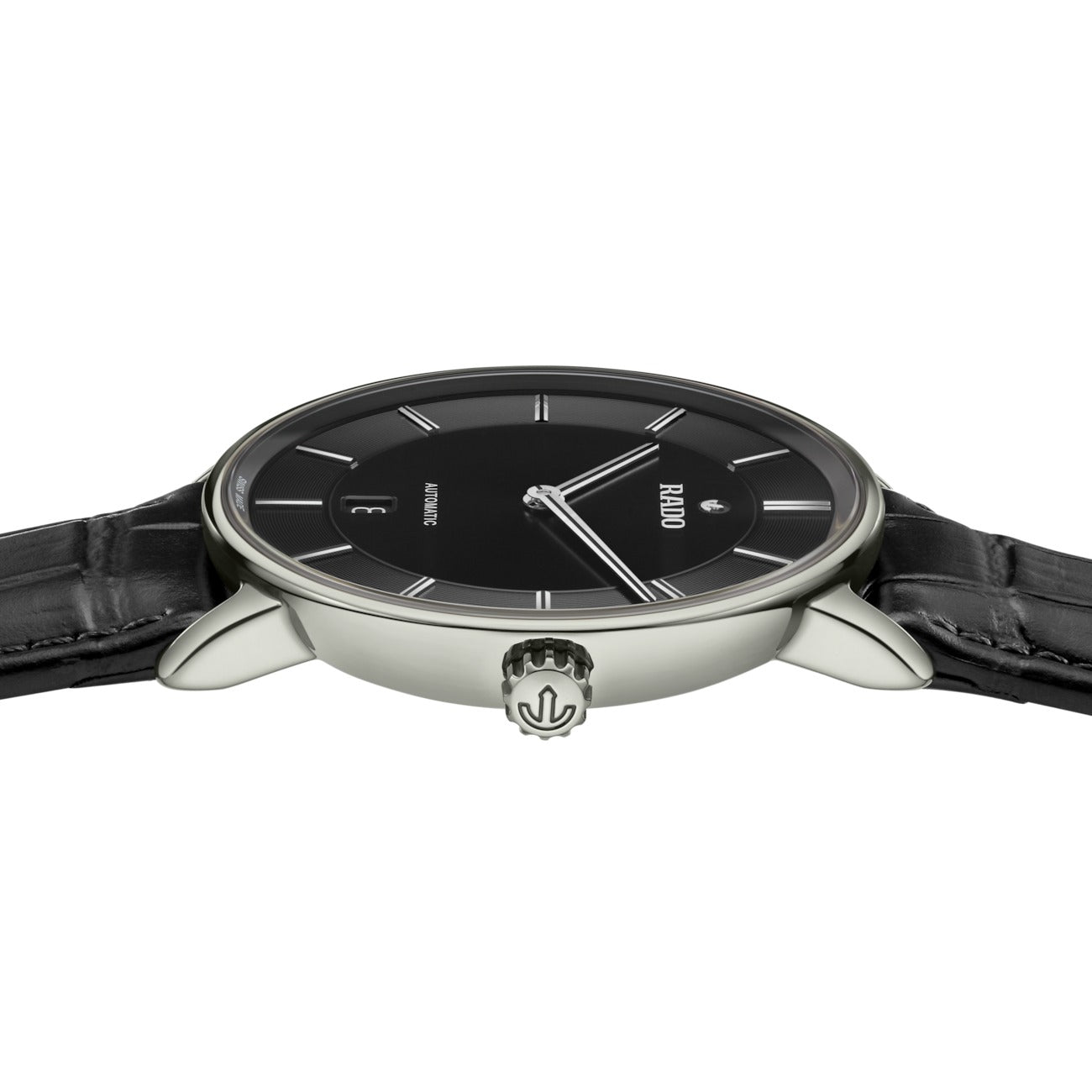 Introducing the Rado DiaMaster Thinline Automatic: Powered by the automatic Rado calibre R766 movement, this watch seamlessly combines tradition and innovation. With an impressive 72-hour power reserve this watch ensures long duration. Housed in a 41 mm polished platinum coloured Ceramos™ case, the DiaMaster Thinline Automatic exhibits a monobloc construction for enhanced durability. The pressed titanium case back, fitted with a sapphire crystal, adds a touch of sophistication. The black dial, accentuated by rhodium coloured applied indexes with a black veneer, showcases a captivating interplay of light and shadows. The rhodium coloured hands, also adorned with a black veneer, provide excellent legibility while adding a subtle touch of luxury. Completing the ensemble is a black leather strap featured with a buckle cover in polished platinum coloured Ceramos™ that exudes both refinement and comfort.