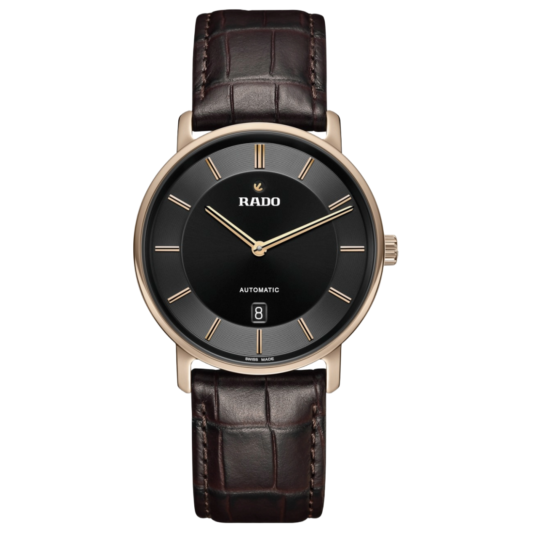 Introducing the Rado DiaMaster Thinline Automatic: Powered by the automatic Rado calibre R766 movement, this watch seamlessly combines tradition and innovation. With an impressive 72-hour power reserve, this watch ensures long duration. Housed in a 41 mm polished rose gold coloured Ceramos™ case, the DiaMaster Thinline Automatic exhibits a monobloc construction for enhanced durability. The pressed titanium case back, fitted with a sapphire crystal, adds a touch of sophistication. The black dial, accentuated by rose gold coloured applied indexes with a black veneer, showcases a captivating interplay of light and shadows. The rose gold coloured hands, also adorned with a black veneer, provide excellent legibility while adding a subtle touch of luxury. Completing the ensemble is a brown leather strap featured with a buckle cover in rose gold coloured Ceramos™ that exudes both refinement and comfort.