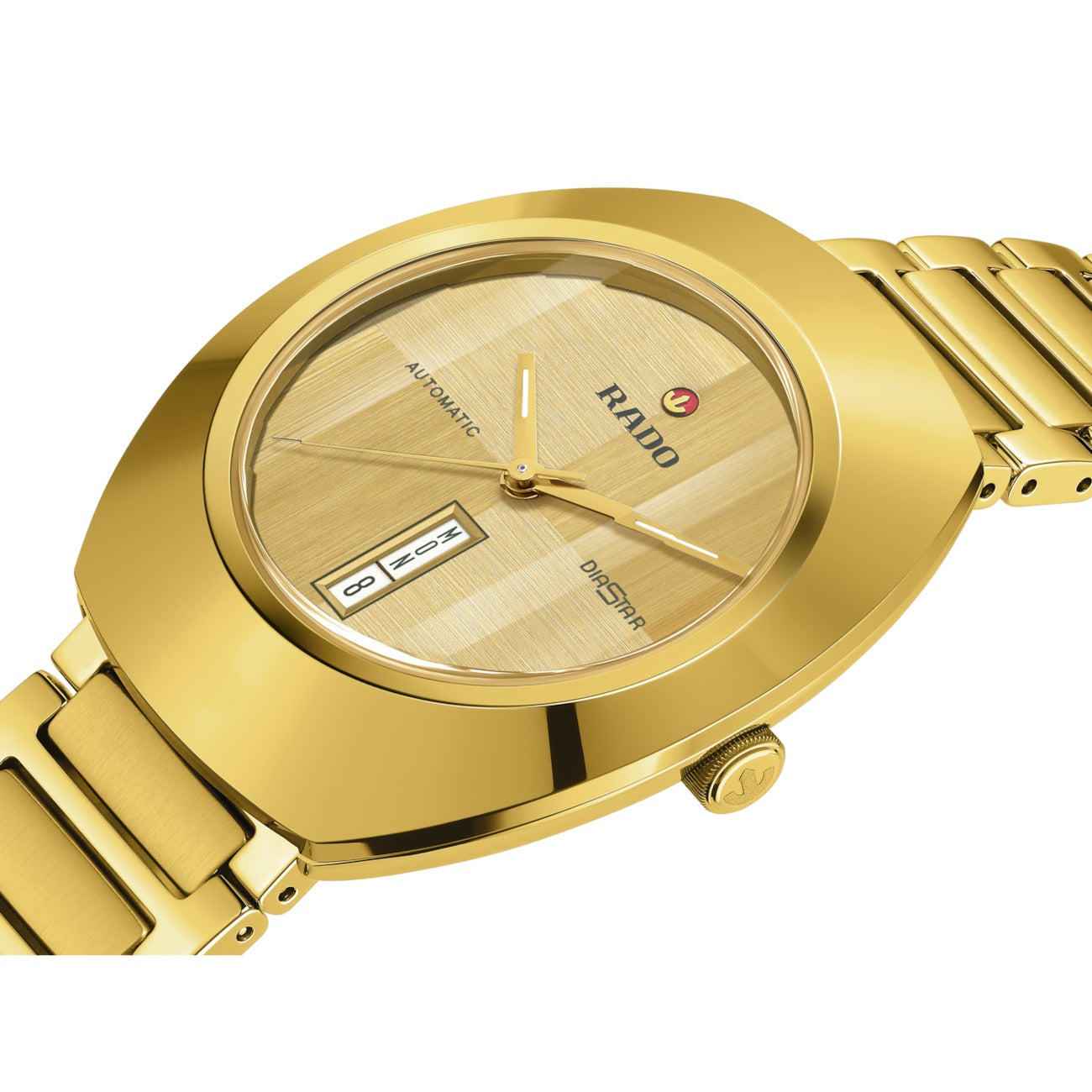 The Rado DiaStar Original combines elegance and durability with its polished yellow gold-coloured Ceramos™ coiffe and matching stainless steel case, offering a refined appearance. This 38mm timepiece is powered by the Rado R764 automatic movement, providing an impressive 80-hour power reserve. The stunning gold brushed dial is highlighted by yellow gold-coloured hands and white Super-LumiNova®, ensuring high visibility. A white day-date display adds practicality to the sophisticated design. The watch also features a parallel-stripe-faceted sapphire crystal and is water-resistant to 100 meters, making it both stylish and functional. The bracelet, made from yellow gold PVD coated stainless steel, adds a final touch of luxury and comfort.