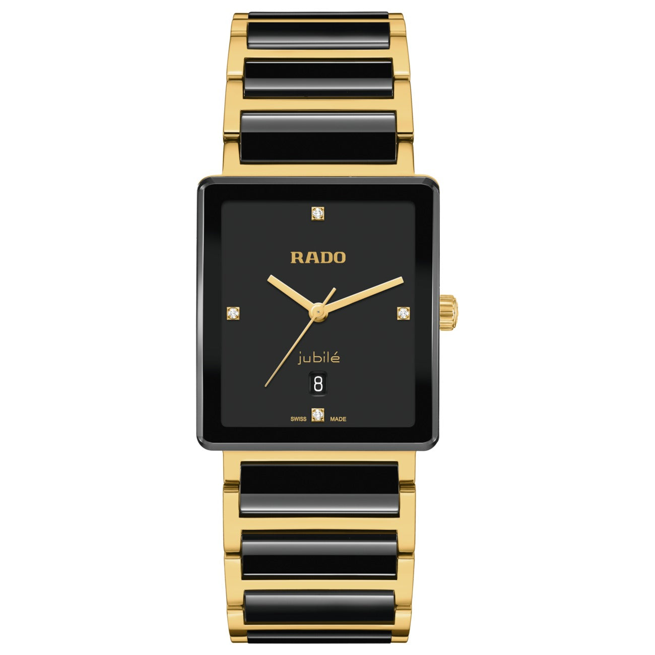 The stainless-steel case with a polished yellow gold PVD finish frames an edge-to-edge, curved and bevelled sapphire crystal with anti-reflective coating and black metallisation. Yellow gold-coloured hands glide over a lacquered black dial, highlighted by the signature four top-class diamonds. Inside, the precise Rado R218 quartz movement with 8 jewels ensures dependable Swiss timekeeping. Completing the design, a lightly tapered bracelet with high-tech ceramic middle links follows the natural curve of the wrist, delivering unmistakable comfort and elegance.
