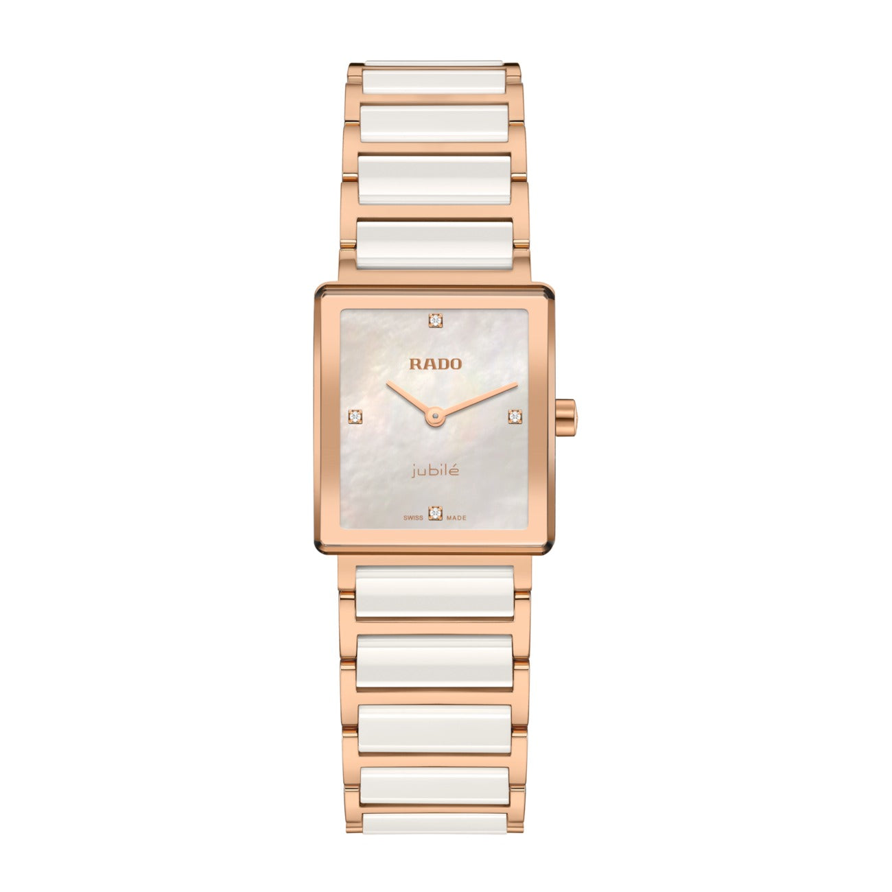 The Rado Integral Diamonds (R20251902) is the epitome of refined elegance, combining iconic design with luxurious materials. Instantly recognisable by its sleek square case and signature four-diamond dial, this exceptional timepiece elevates the Integral collection with a lustrous white mother-of-pearl dial and polished rose gold PVD accents.