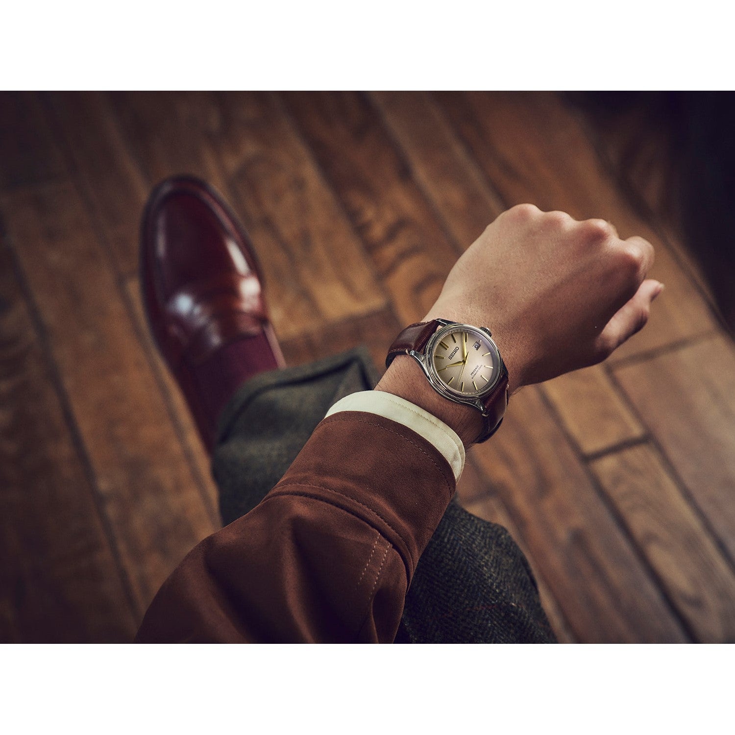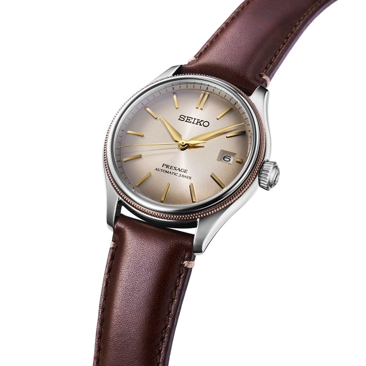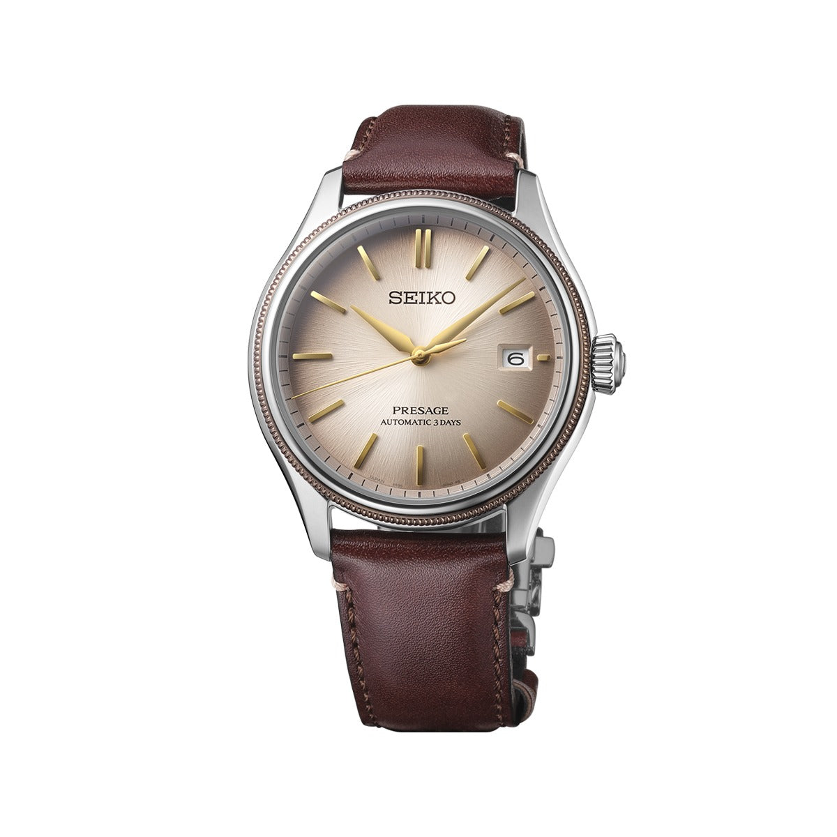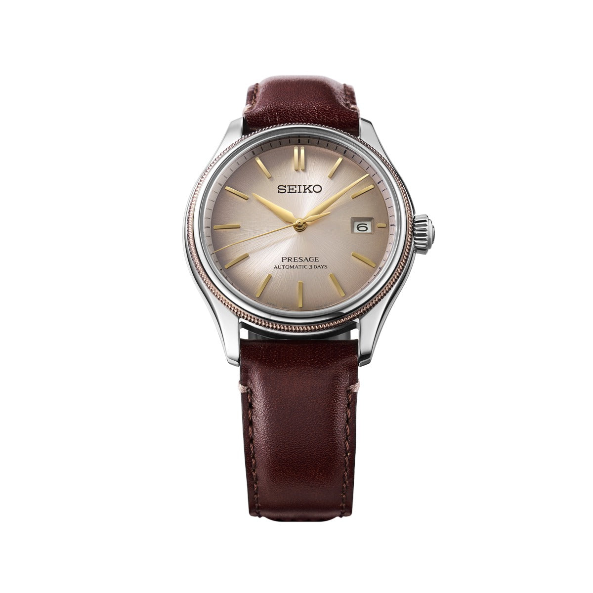The Seiko Presage 3-Hands Classic Series Limited Edition Men's Watch (SPB529J1) embodies the authentic charm of the Classic Series. Its dial features the historic Shiracha colour, popular since Japan’s Edo period, enriched with a smoky gradient that evokes the natural patina of aged materials. This blend of tones creates a captivating depth and vintage allure. The mirror-polished stainless steel case contrasts beautifully with a brown ion-coated bezel, exuding a warm, refined character. The finely ribbed case edge enhances its timeless design, balancing classic sophistication with a modern twist. The brown leather strap, crafted in collaboration with a renowned Japanese shoemaker, uses high-quality leather remnants—transforming what’s leftover into something luxurious and sustainable. The strap’s interior, made from premium shoe lining material, ensures exceptional comfort and softness on the wrist.