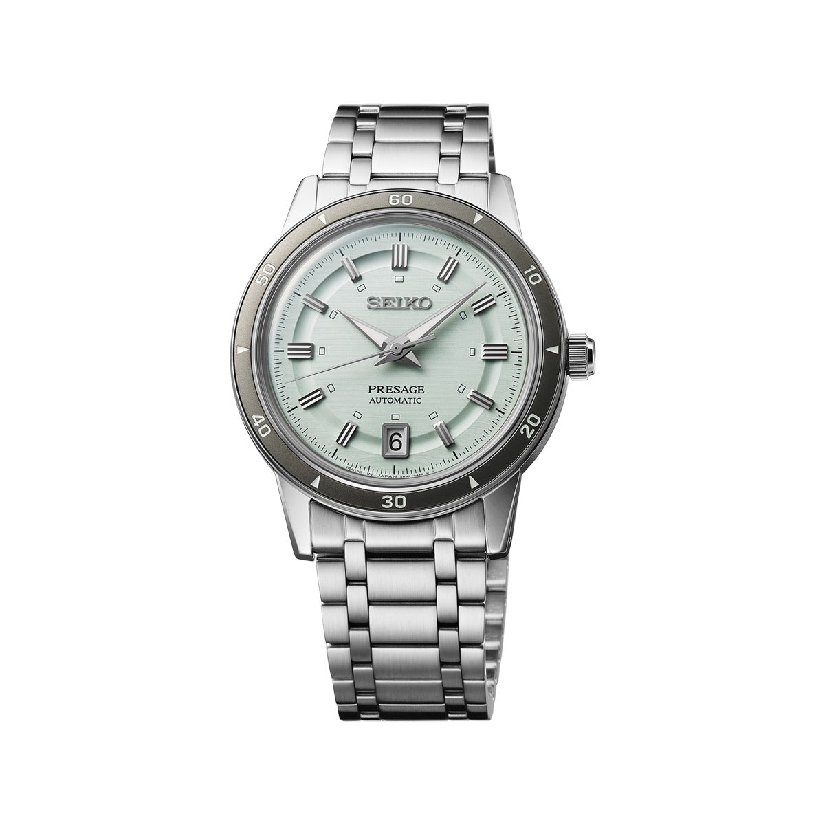 Step back in time with the Seiko Presage Style 60's SRPL71J1, a tribute to the vibrant design aesthetics of the 1960s. Featuring an eye-catching ice green dial with a raised circle effect and vintage-style case design, this timepiece draws inspiration from the original 1964 Seiko Crown Chronograph. Designed for those who appreciate heritage and modern reliability, this automatic watch is an elegant addition to any wrist.