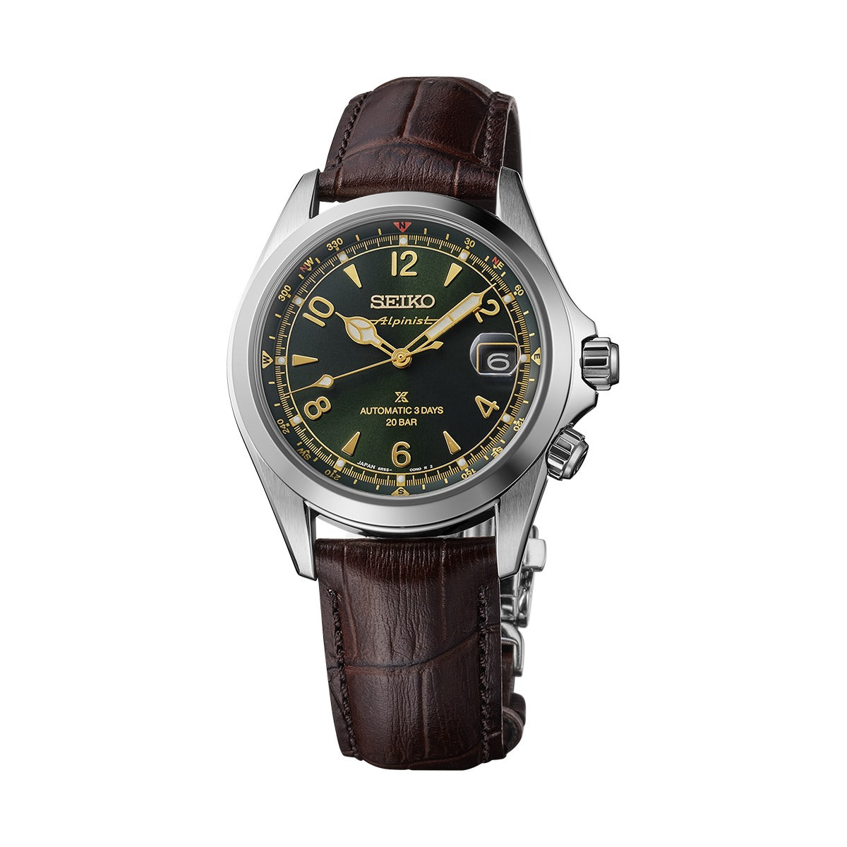 Beneath a sapphire crystal with magnifier, the archive-inspired classic pine green dial is complemented by distinctive cathedral-style hands, Arabic numerals, and wedge-shaped indices. The traditional Alpinist logo sits proudly beneath the Seiko logo, echoing the original Laurel Alpinist. A rotating compass bezel enhances its field functionality, while the super-hard coated stainless steel case offers increased scratch resistance and brilliance. Through the exhibition case back, the in-house 6R55 automatic calibre is visible, delivering -15/+25 seconds per day accuracy and a robust 72-hour power reserve.