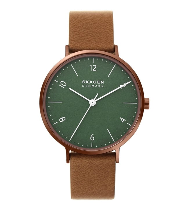 Carry great technology wrapped around your wrist with this stylish women's analog watch from Skagen. Functional on a quartz movement and protected by a mineral glass, the green round dial is housed in a case. It displays plain 3-hand, and a crown for time adjustment. The strap exudes a brown hue that accentuates the look of the watch. Besides, it is completed with a buckle clasp that ensures a secure fit on the wrist.