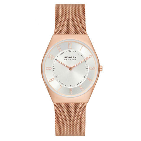 This 37mm Grenen Ultra Slim watch features a silver white sunray dial, at least 50% recycled stainless steel case, two-hand movement and rose gold stainless steel mesh strap. Watch strap is not interchangeable.