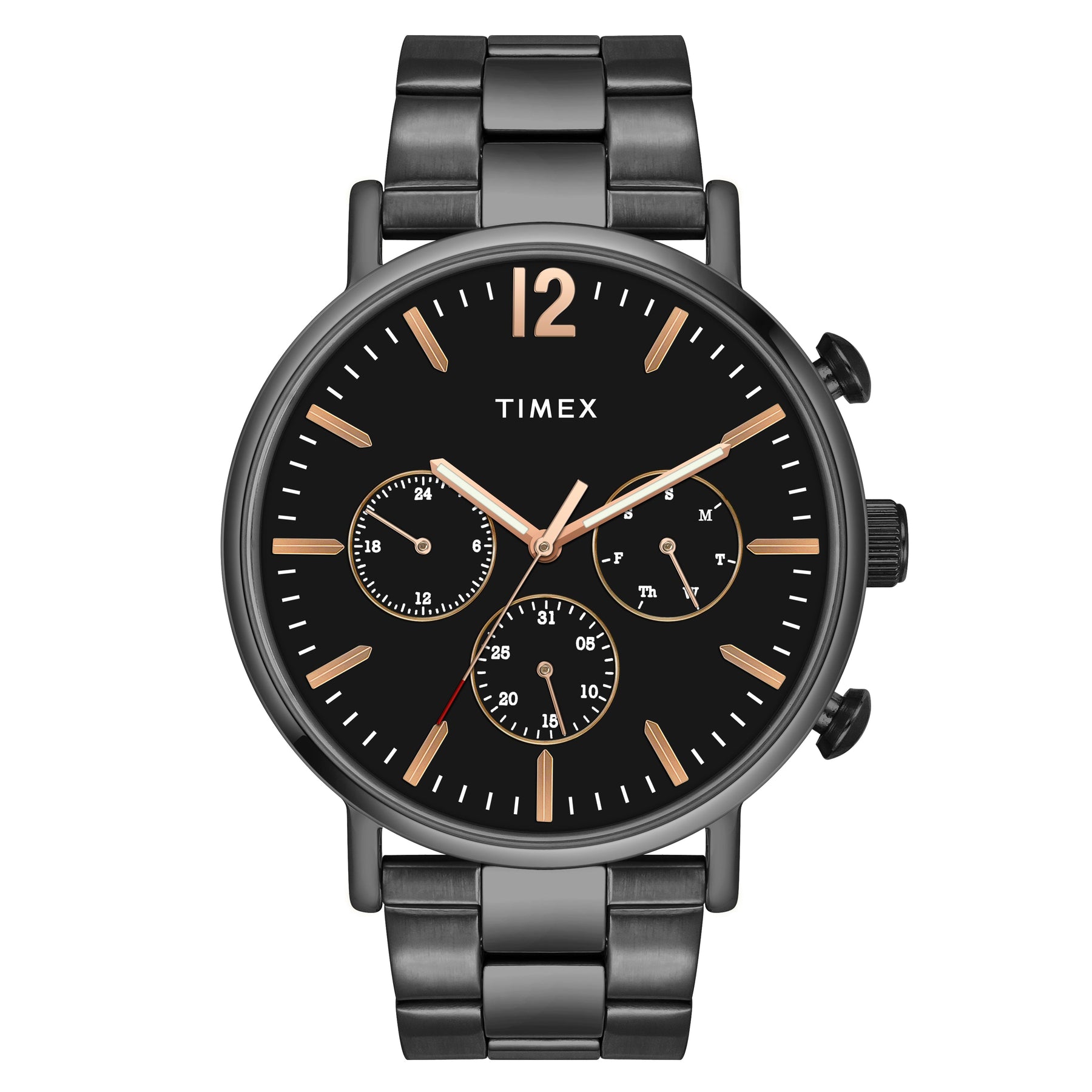 The Timex Fashion Men's Black Dial Round Case Multifunction Watch TWEG20011 blends style with functionality. Featuring a bold 43mm brass case, a sleek black dial, and a matching black strap, this timepiece is powered by reliable quartz movement. With 30-meter water resistance and a multifunction display, it’s a perfect companion for everyday wear.
