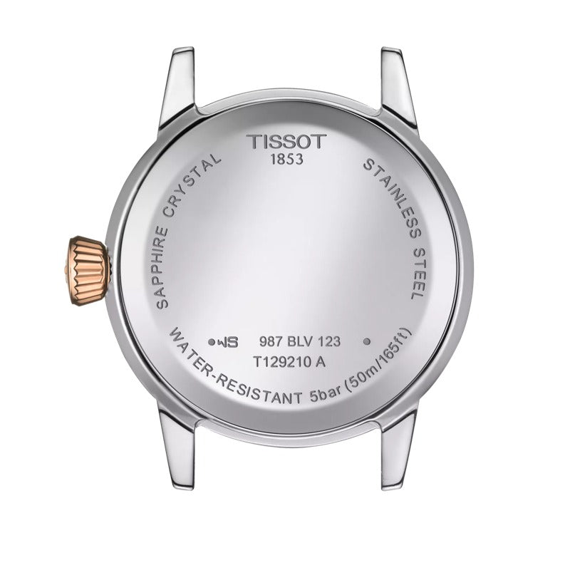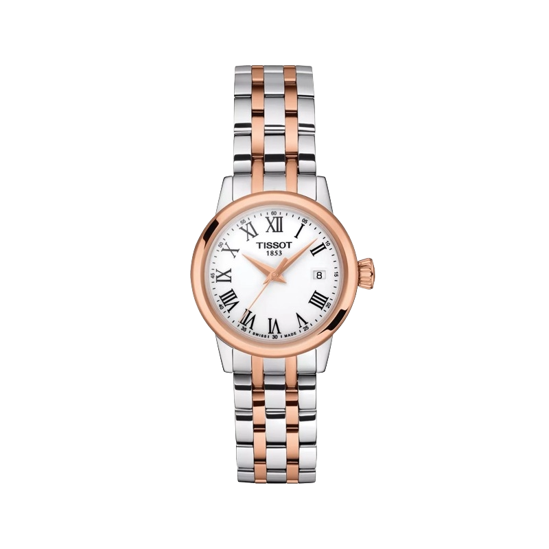 The Tissot Classic Dream Lady T129.210.22.013.00 blends timeless elegance with Swiss precision. Featuring a graceful 28mm round case in stainless steel with rose gold PVD accents, this ladies' watch offers a refined white dial adorned with Roman numerals. The slim profile and two-tone bracelet with a butterfly clasp deliver a sophisticated and versatile look, perfect for both formal occasions and everyday style. Powered by a reliable Swiss quartz movement with an EOL indicator, this watch combines heritage charm with modern functionality.