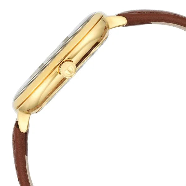 Experience classic charm with this brown and black combination timepiece. The sharp rectangle black dial, adorned with gold bezel detailing, features a subtle sheen and textured elements. Silver indices and gold hands complement two sub-dials for precise day and date tracking. The warm-toned brown leather strap ensures perfect comfort, making it an ideal accessory for all workwear