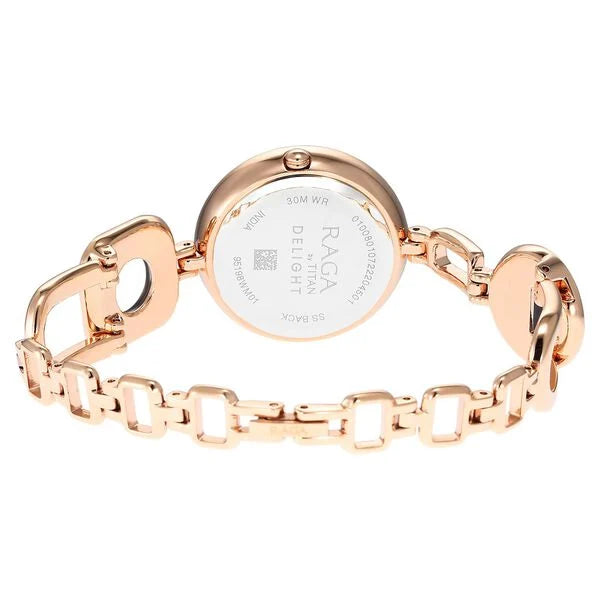 Get an urbane look by wearing this women's analog watch from the Raga Delight collection by Titan. Its round-shaped purple dial is protected in a case of 35.6 mm diameter. The stainless steel bracelet of this watch exudes a rose gold hue for an attractive look. Its jewelry clasp ensures a secured fit around your wrist. The inclusion of plain 3-hand quartz movement adds to its features.